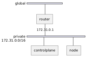 コントロールプレーン、ノード1台ずつの構成とします。プロキシを経由しなければインターネットに出られないようになっています。