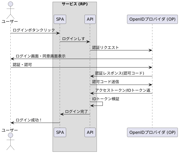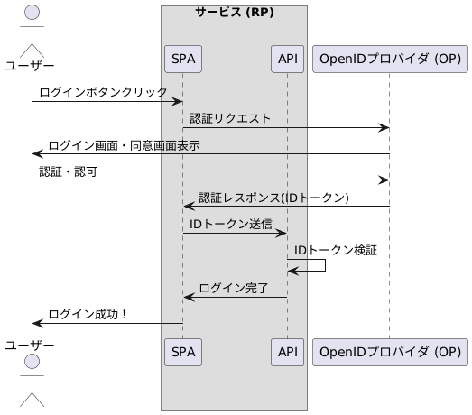 ユーザーがサービスにログインしようとすると、サービスはまず OpenID プロバイダー(OP)のエンドポイントに対してユーザーをリダイレクトします。OP は未認証であればログイン画面を出しユーザーを認証してから、サービスに対して認可を行うかどうか同意を取ります。ユーザーが同意すると、OP は ID トークンをリクエストに含めてサービスのコールバック URL にリダイレクトします。サービスは受け取った ID トークンが正規の OP からのものであることを OP の公開鍵を使用して検証します(そのほかにも複数の検証をする)。検証が正常に終了すればサービスへのログインの処理は完了です。