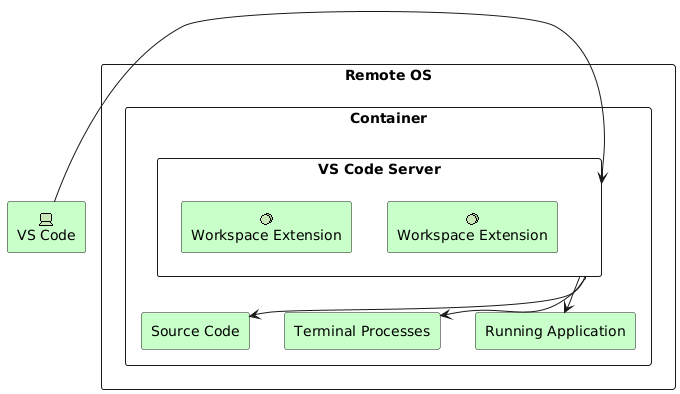 なので、ホスト上に VS Code Server をインストールしたところで実際の開発環境に入り込むことができないので、であれば開発環境のコンテナ上に VS Code Server を入れて直接乗り込もう、というのが今回の趣旨になります。