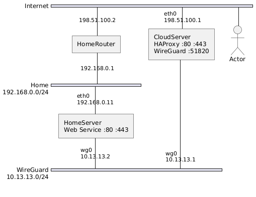VPN でクラウドと自宅との間が暗号化されているので、HAProxy で SSL 終端する、みたいな構成も可能かも。WireGuard の自宅サーバー側の peer や HAProxy の転送先を冗長化する、みたいな構成をとるのも面白いかも。