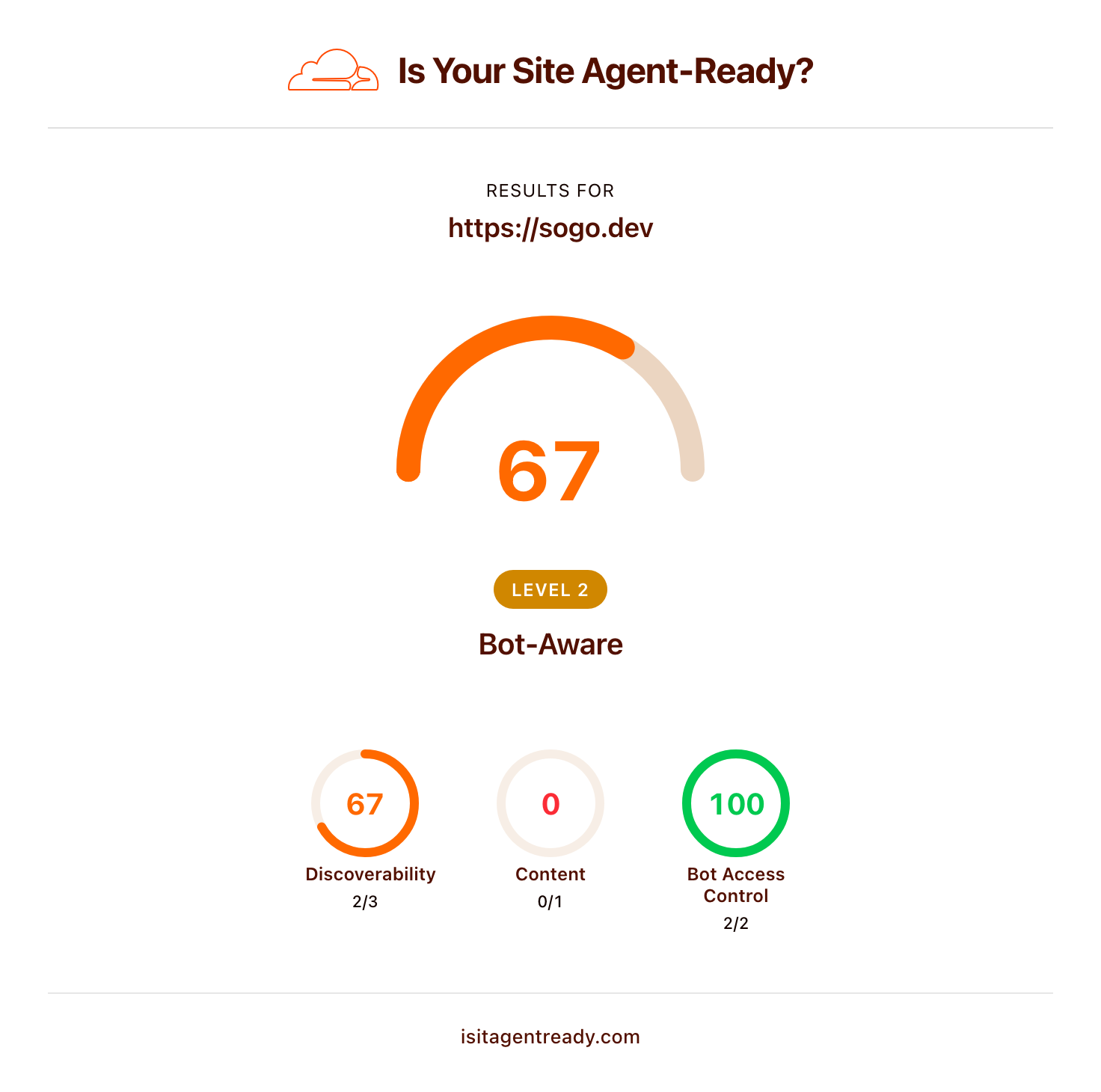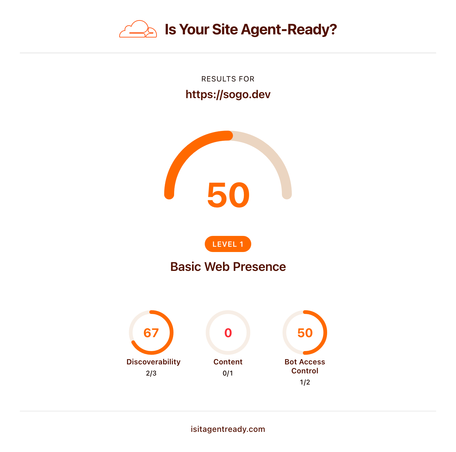 Cloudflare が、自分のサイトが Agent-Ready であるかどうかを測定できるサイトを公開 しました。AI エージェントがサイトを発見しやすいか、内容を取り込みやすいか、利用方針を機械的に解釈できるかといった観点をまとめて確認できるツールです。
